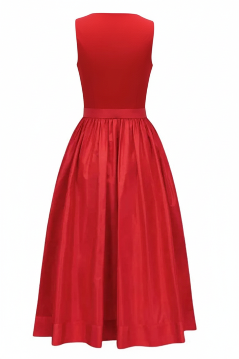 - Material: Smooth matte red bodice paired with a glossy red satin skirt.