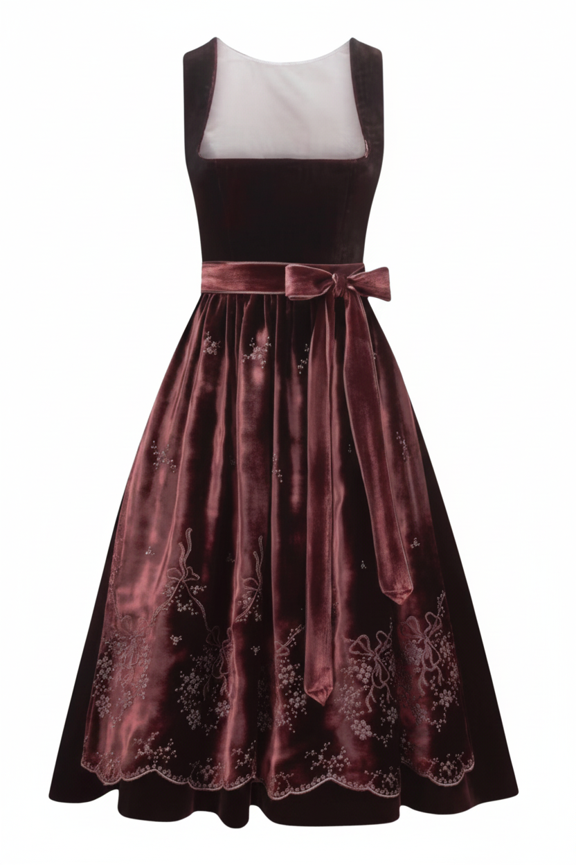 This beautifully crafted piece showcases a soft, warm rose color with a gentle sheen that highlights its refined style. The bodice has a smooth, structured texture that contrasts gracefully with the fuller, silky skirt, creating movement and depth. Its ribbon waistband adds a delicate accent that pairs naturally with the charm often found in a classic Bavarian Outfit worn during the lively spirit of the Oktoberfest Festival.