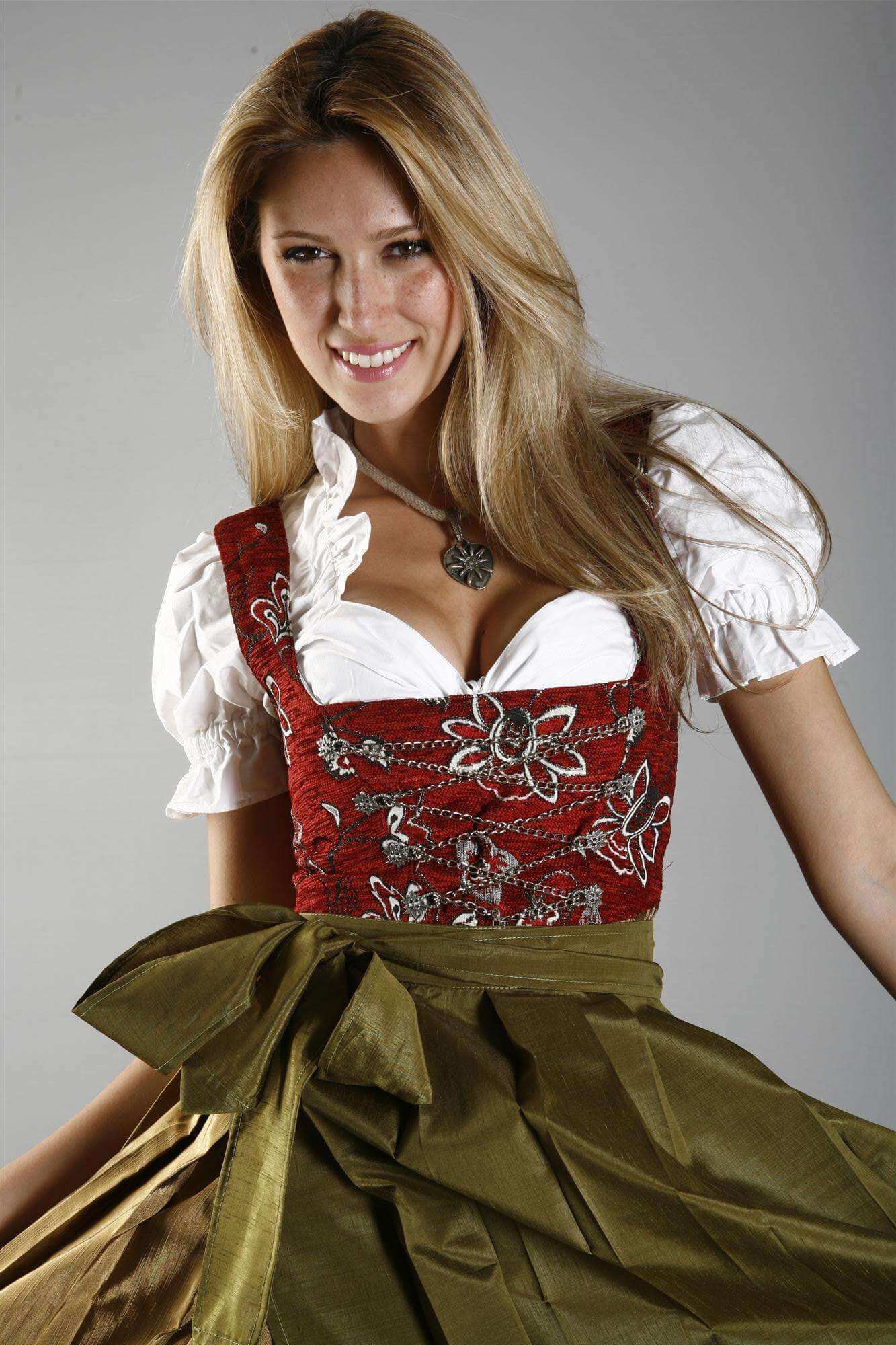The Bavaria Stefanie Giesinger dirndl by Bavarian Attire blends rich color with refined craftsmanship, creating a look that feels both classic and modern. Its deep red bodice features raised floral textures that add depth and elegance. A crisp white blouse completes the structured Dirndl Female silhouette with clean contrast.