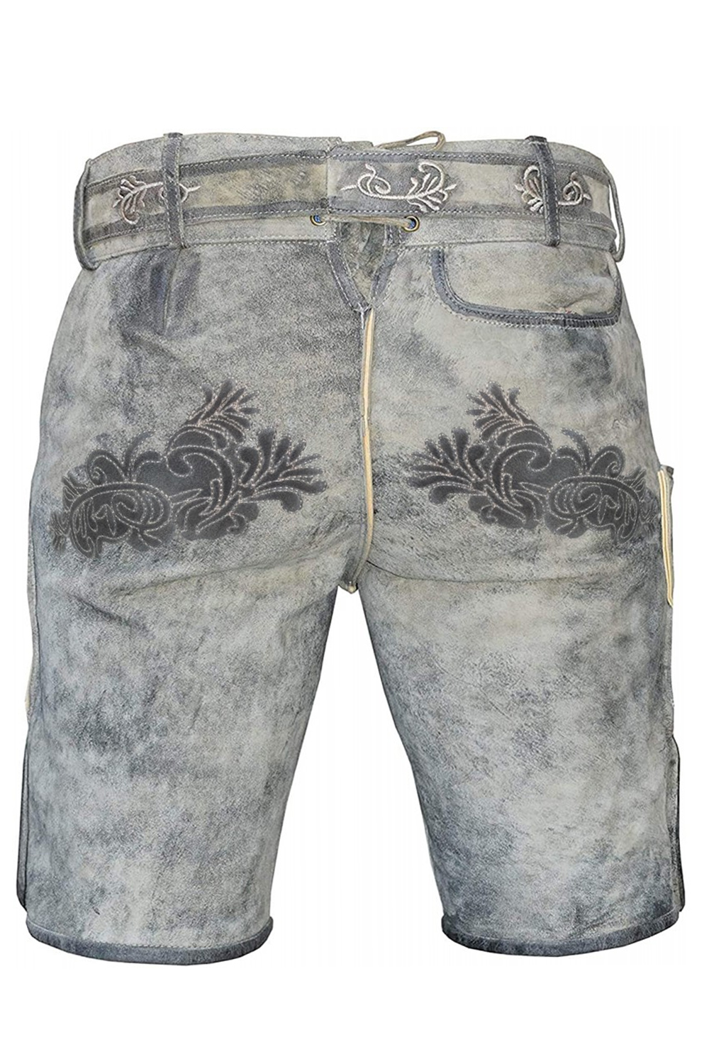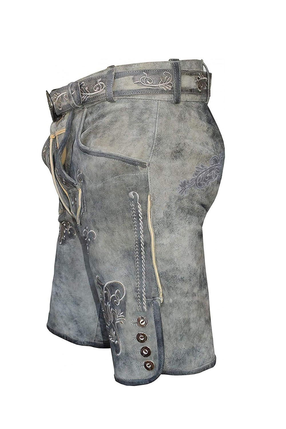 These historical shorts are made of soft goat suede with a worn grey appearance. They include strong stitching, intricate embroidery, and traditional Bavarian design. They provide the ideal fusion of heritage and contemporary functionality for celebratory occasions or ethnic attire since they are cosy, long-lasting, and exquisitely textured.