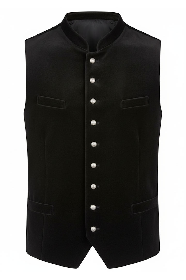 This exquisitely crafted black waistcoat will allow you to experience the luxurious richness of fine velvet. It adds genuine Alpine sophistication to any modern gentleman’s wardrobe with its elegant stand-up collar and recognizable silver buttons.