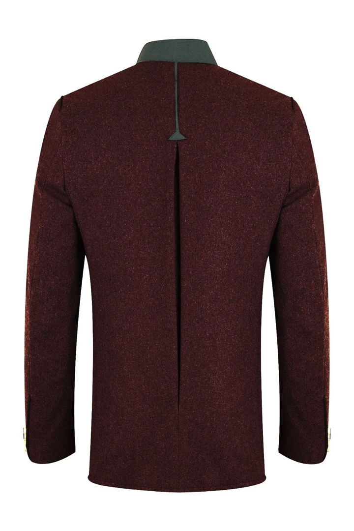 This premium wool Trachten jacket features a rich brown speckled texture with shimmering details and vibrant green accents. It offers timeless comfort, authentic Bavarian style, and versatile layering for festive occasions.