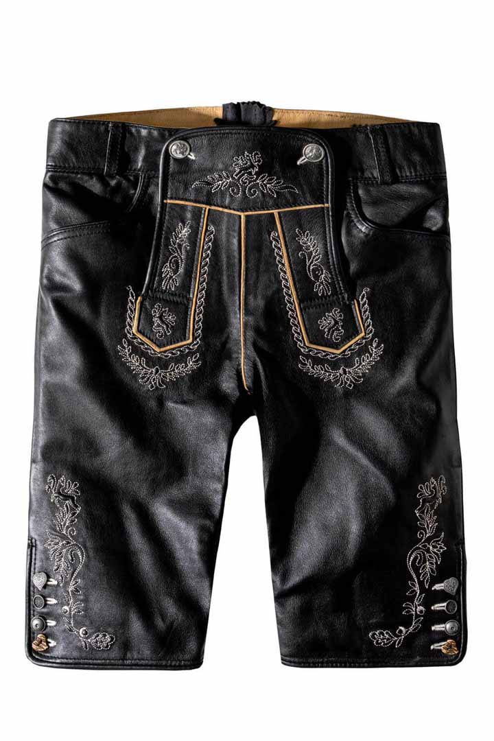 With these finely tailored black breeches, experience the opulent sensation of real goat suede. For any festive occasion, they provide a stylish, long-lasting substitute for traditional Alpine skirts with their elaborate flower embroidery and adjustable details.