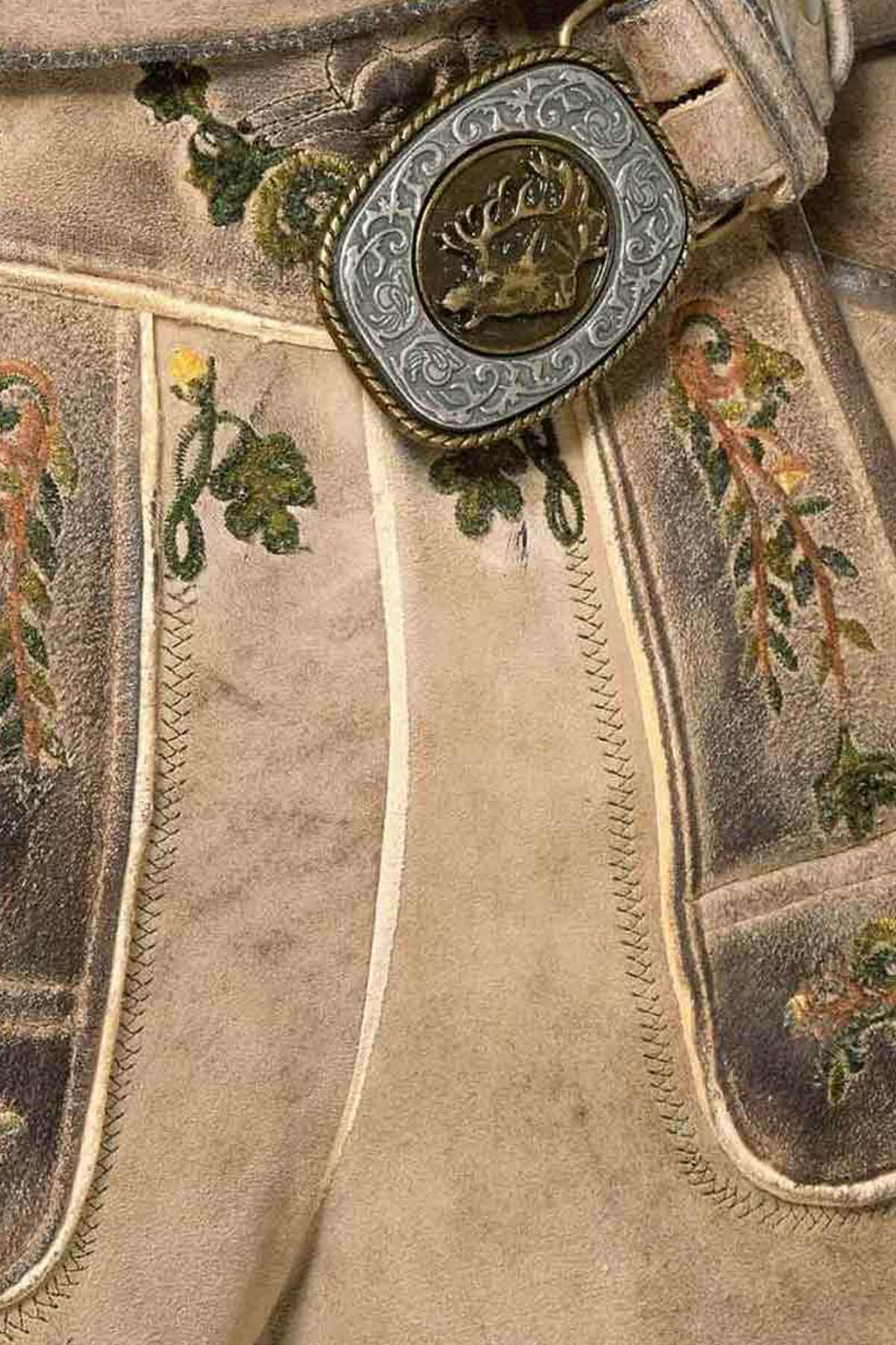 The superb German craftsmanship displayed by these Trachten Lederhosen instantly defines Bayerische culture. The garment was made from premium goat suede leather, which has a genuine, worn-in feel and a delicate, brushed texture. Additionally, the delicately distressed light beige/taupe hue creates the ideal backdrop for elaborate, vibrant embroidery, setting these essential men’s German shorts apart.