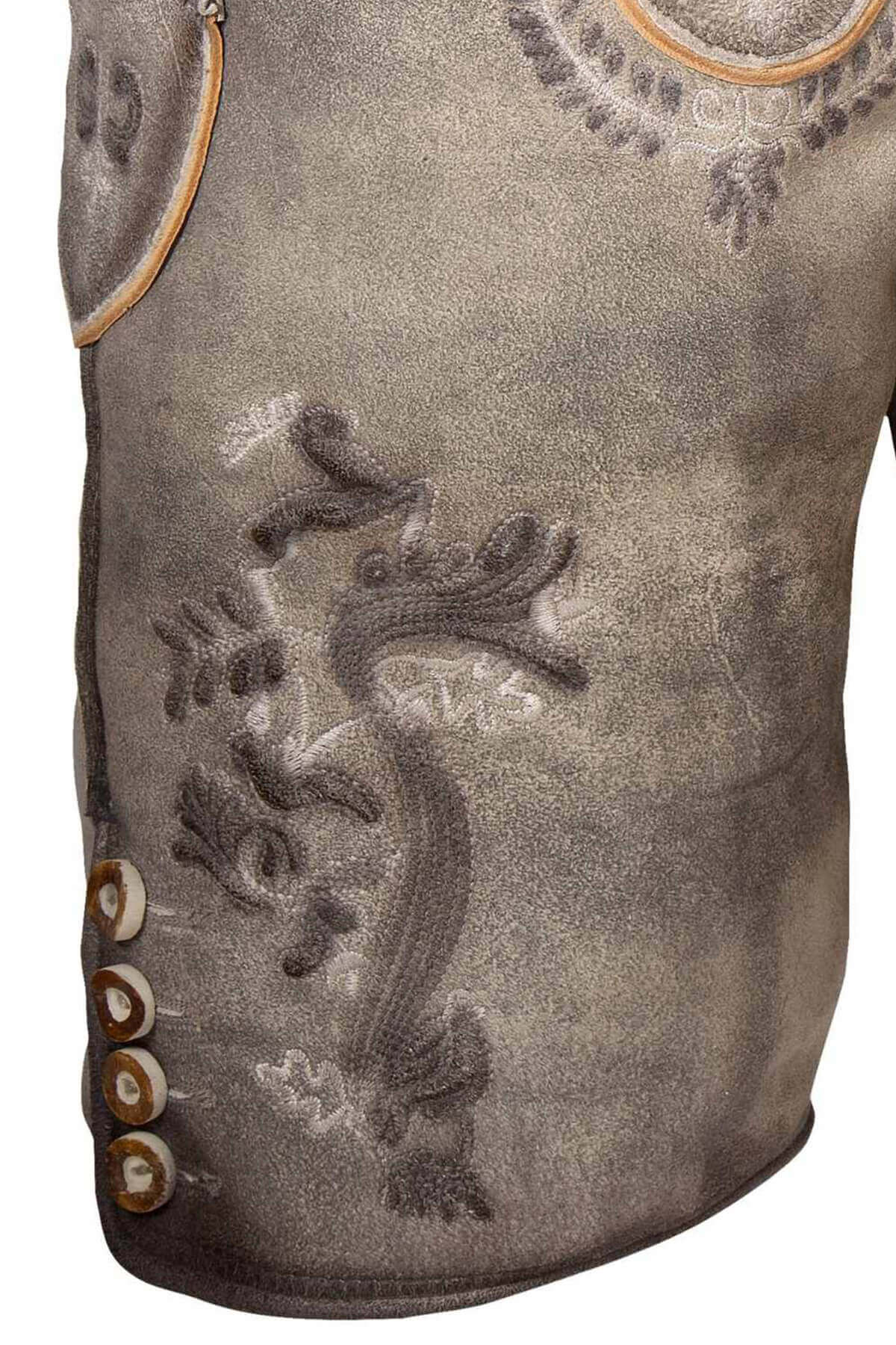 The velvety texture and superior quality of the goat suede are key to this garment’s appeal. Unlike heavier leather, this model feels flexible and lightweight, allowing unrestricted movement for any Volksfest Outfit Herren. The suede is durable despite its softness and is designed to develop a unique patina over time, enhancing its authentic, historic character.