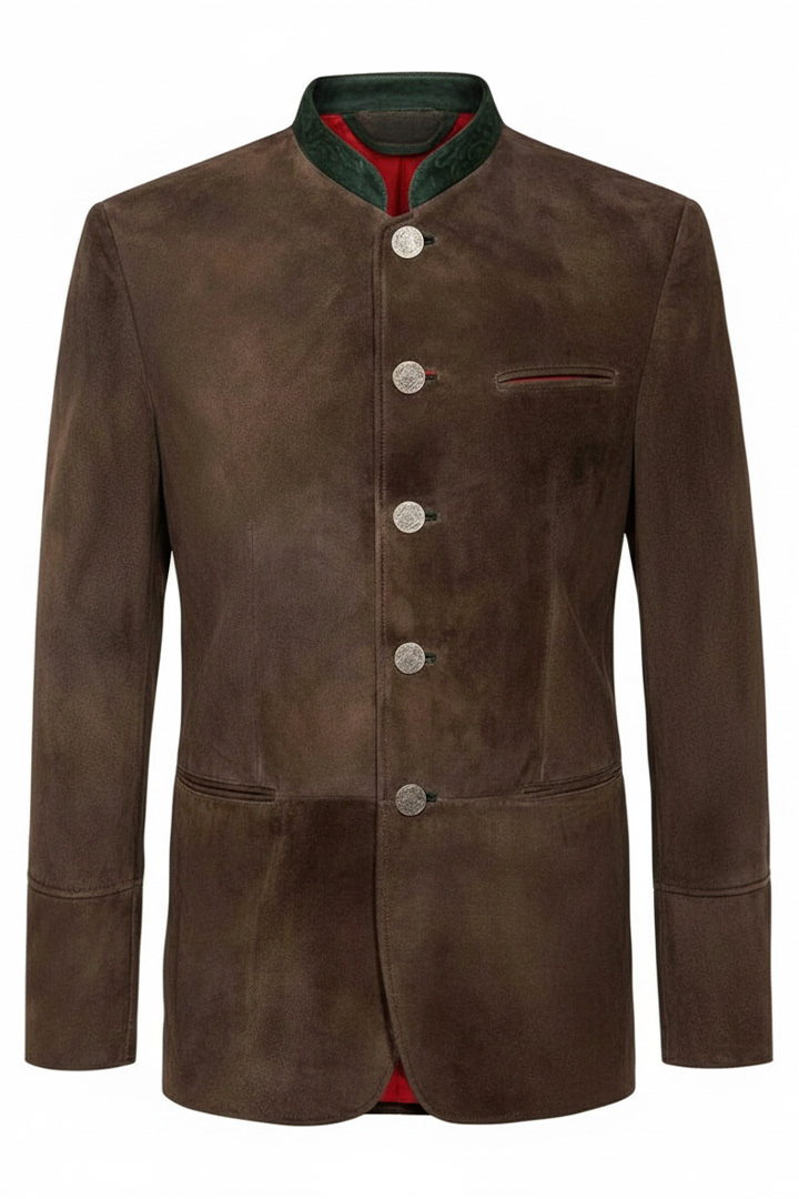 Beyond its striking look, the jacket features a forest green stand-up collar and a vibrant red lining for contrast. Additionally, many enthusiasts choose it as a signature Oktoberfest Jacket. Its versatile cut layers easily over Trachten Shirts. The silver-toned ornate buttons also add a historic touch, echoing the elegance of classic Waistcoats & Vests.
