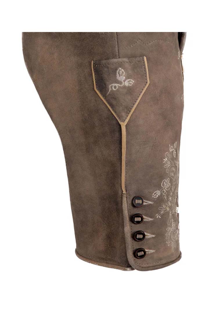 Find high-quality goat suede shorts with beautiful oak leaf embroidery and useful cargo pockets. These real Bavarian breeches are soft and strong, making them great for traditional Alpine activities and joyous festivities.