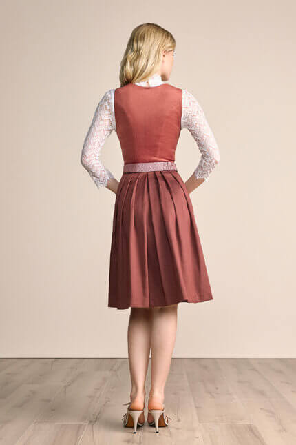 This dirndl blends a velvety rose bodice with a softly patterned pink skirt, creating an elegant and feminine look. Its lace blouse adds light detail, while the apron completes the refined style. Comfortable tailoring and gentle colors make it ideal for festive occasions and graceful traditional events to wear anywhere.