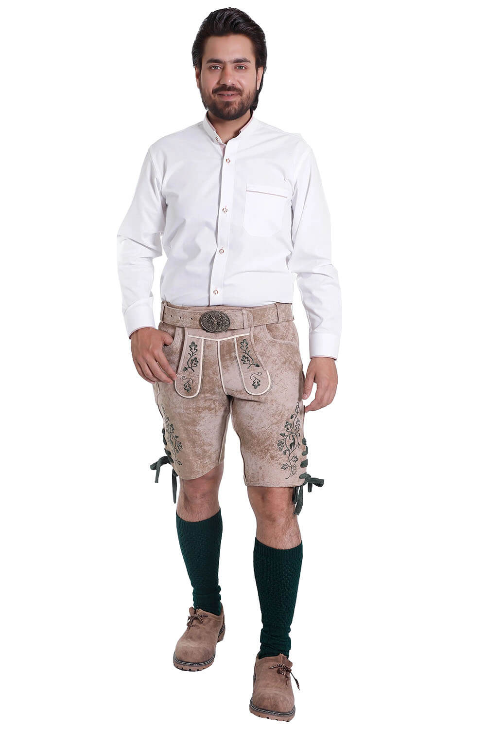 The goat suede leather’s velvety texture is accentuated by the shorts’ warm chamois-beige color. A natural depth that is both rustic and elegant is created by the subtle tone variations in their velvety surface. Additionally, the rich green embroidery creates a striking contrast that complements a Bavarian or Men’s Traditional Outfit.