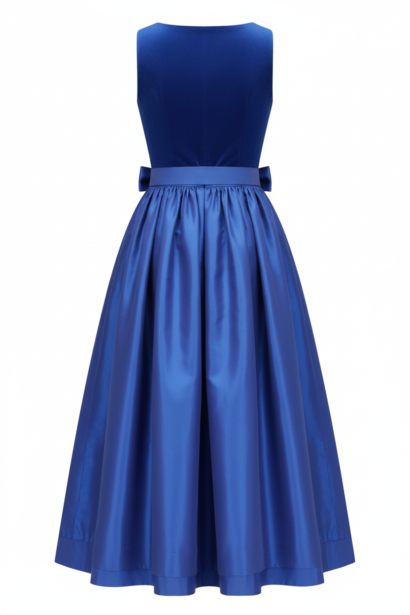 This dirndl features a velvety royal-blue bodice, a glossy matching apron, and a delicate white lace blouse that adds soft contrast. Its fitted top and flowing skirt create a graceful, timeless shape. The satin bow gives it a polished finish, making it elegant for festive and cultural occasions.
