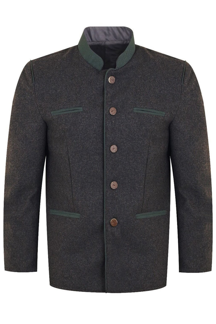 The Bavarian Attire Giesler Trachten Jackets has a sophisticated shape and perfect craftsmanship that show off real Alpine history. The stand-up collar on this Oktoberfest jacket is a deep forest green that stands out against the salt-and-pepper gray wool body. The design is also improved by the horn-style buttons and fine green piping. These give the jacket a powerful visual character that is perfect for ethnic celebrations around the world today.