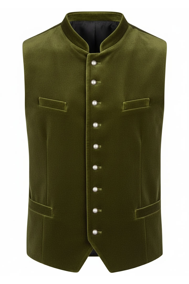 This opulent olive velvet vest will elevate your conventional wardrobe. With its fitted fit and genuine silver buttons, it adds a refined touch to any formal cultural festival or festive occasion.