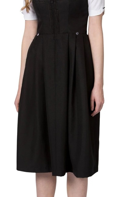 This refined Midi Dirndl pairs a deep black skirt with a smooth, structured fabric that feels stable yet soft to the touch. The fitted bodice shapes the waist beautifully and contrasts elegantly with the crisp white blouse. Its clean, understated look makes it a reliable choice for those wanting to Buy Dirndl Online.
