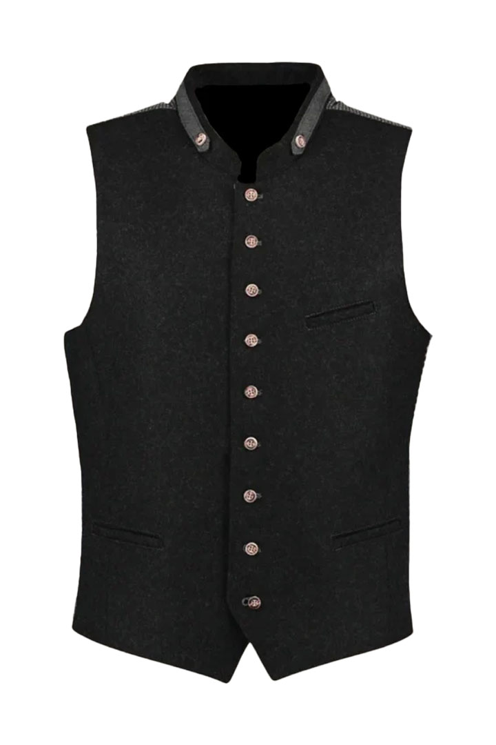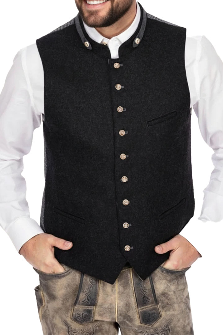 To emphasize its heritage nature, this Bavarian vest features a unique stand-up collar with contrasting grey piping. In addition, the intricate stag-horn buttons stand out sharply against the dark wool. In chilly weather, it looks great layered under structured Trachten Jackets, but it also looks great on its own.