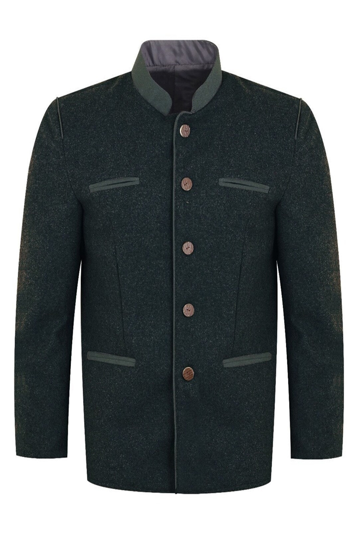 This high-quality wool jacket will let you show off your real Bavarian craftsmanship. It has a rich loden green color and classic horn buttons. It has a classy shape that works for both festive occasions and formal dress inspired by the Alps.