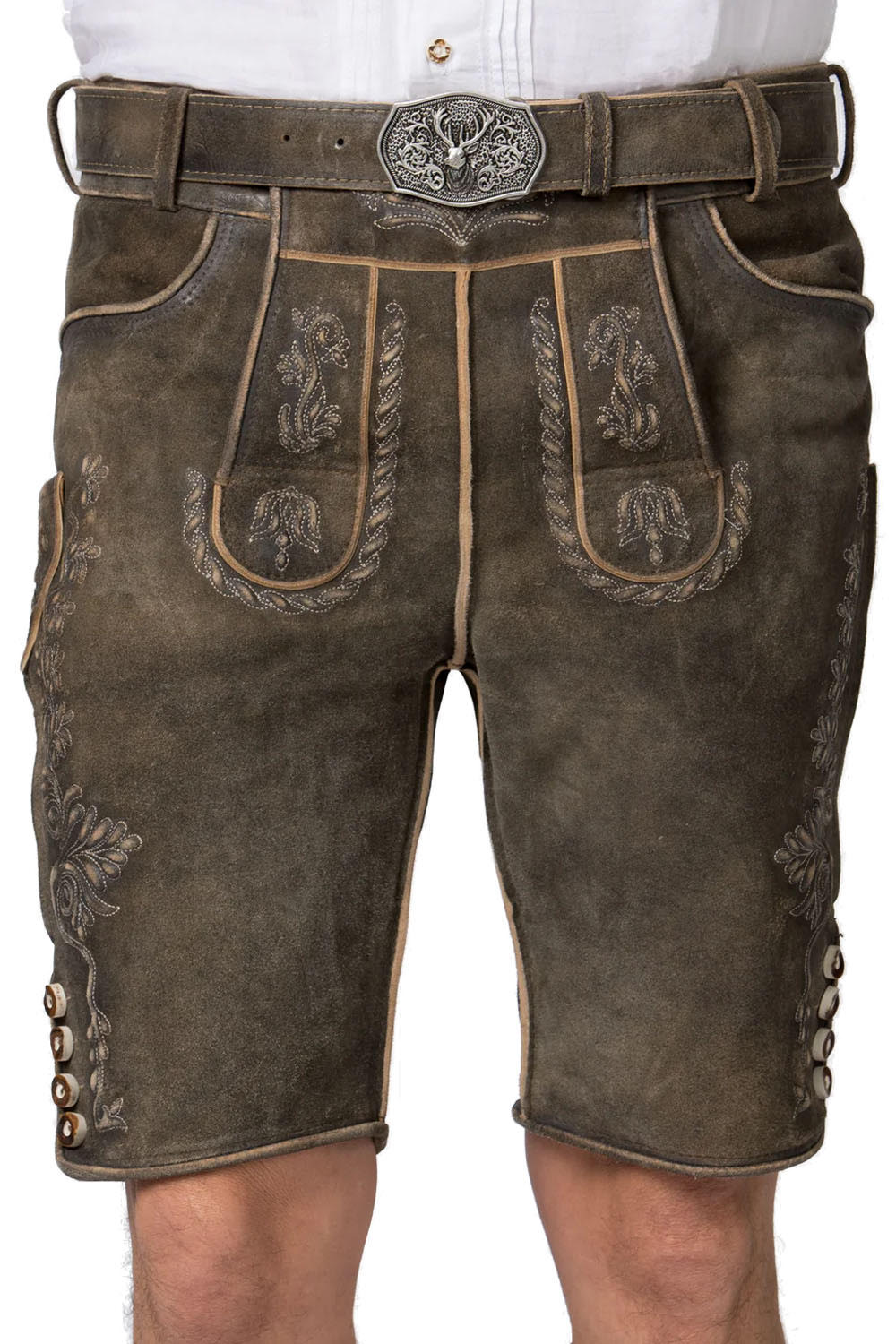 The soft goat suede leather used to make Maik Lederhosen Shorts has a natural brown hue and a smooth texture. These shorts are made in the typical Bavarian style and are comfortable, long-lasting, and include useful details. They combine traditional style with modern functionality, making them great for festive occasions or casual outdoor wear.