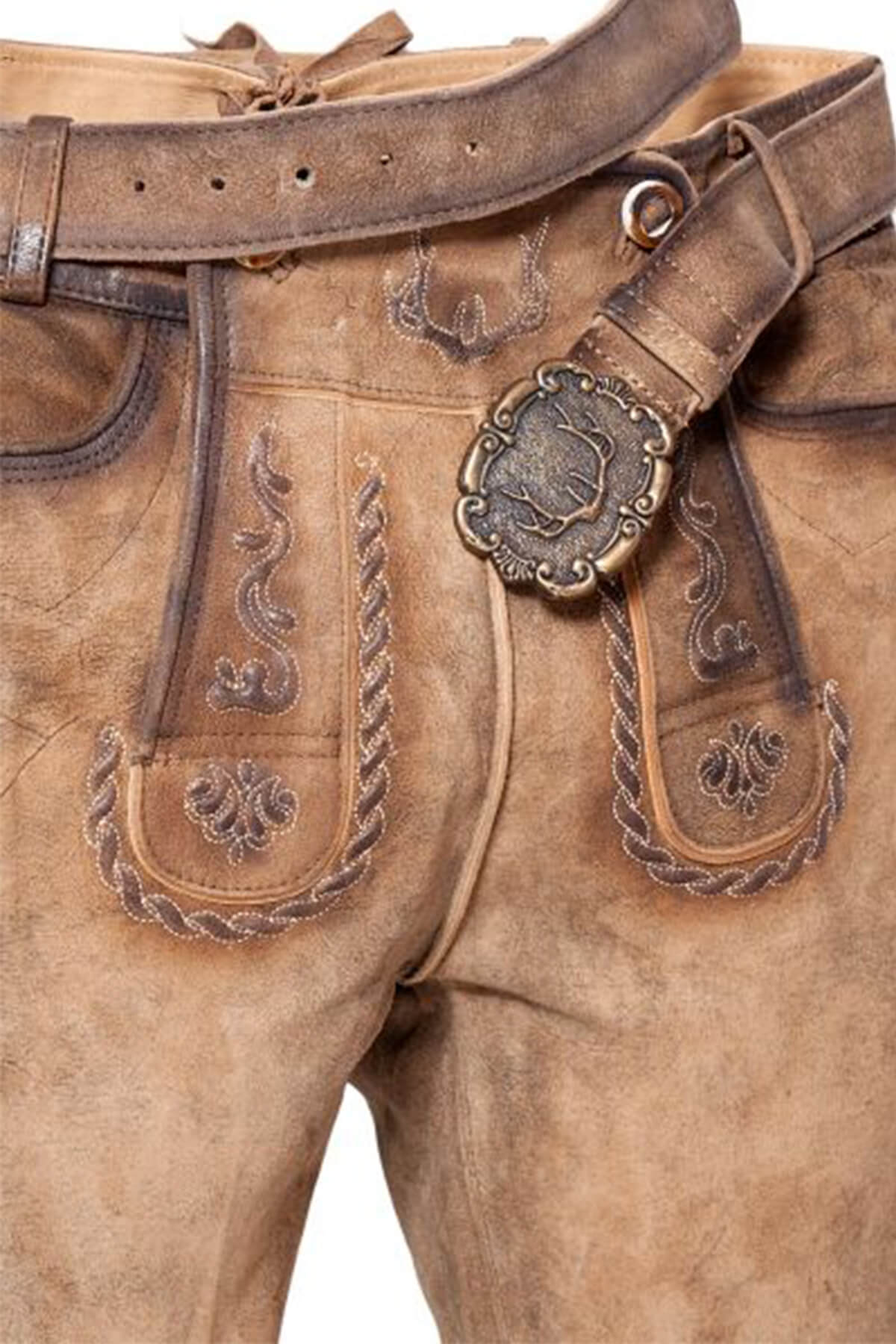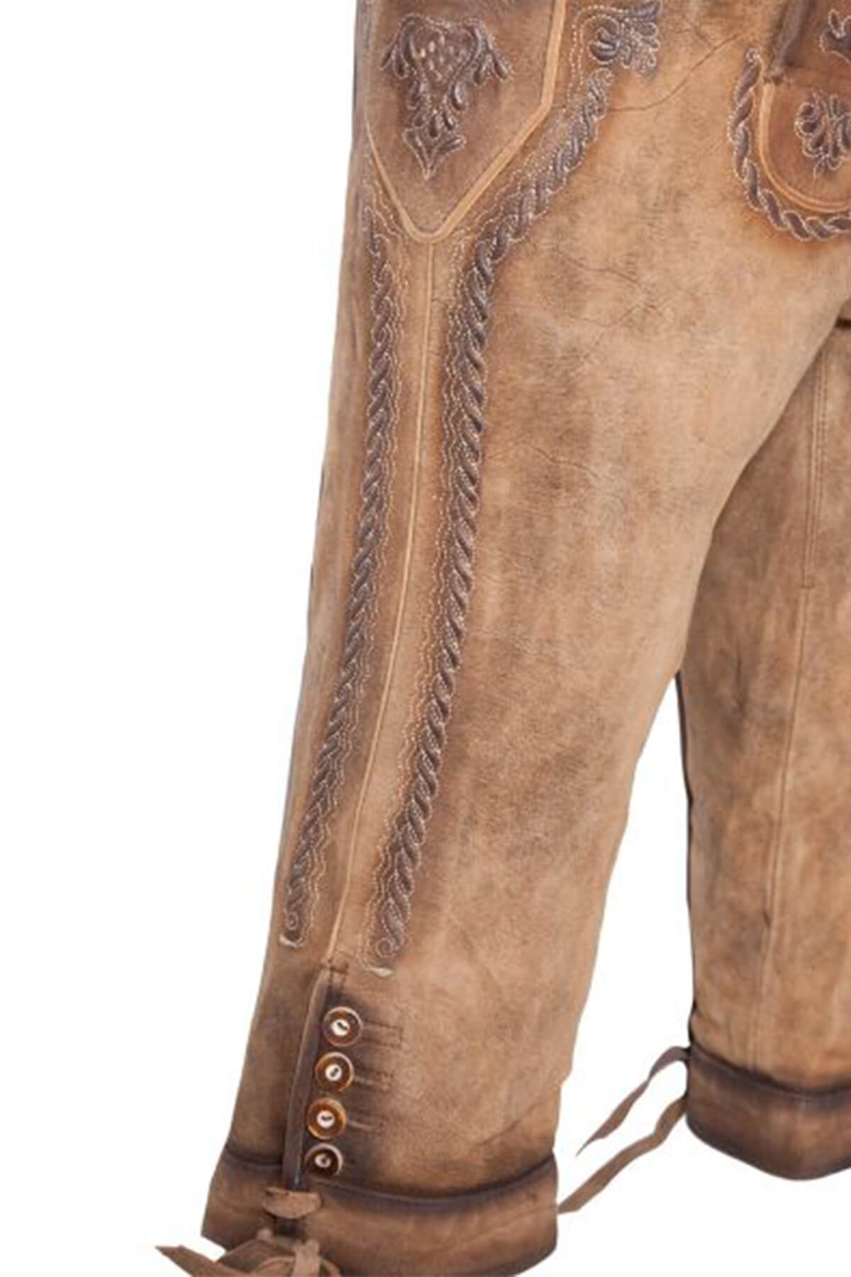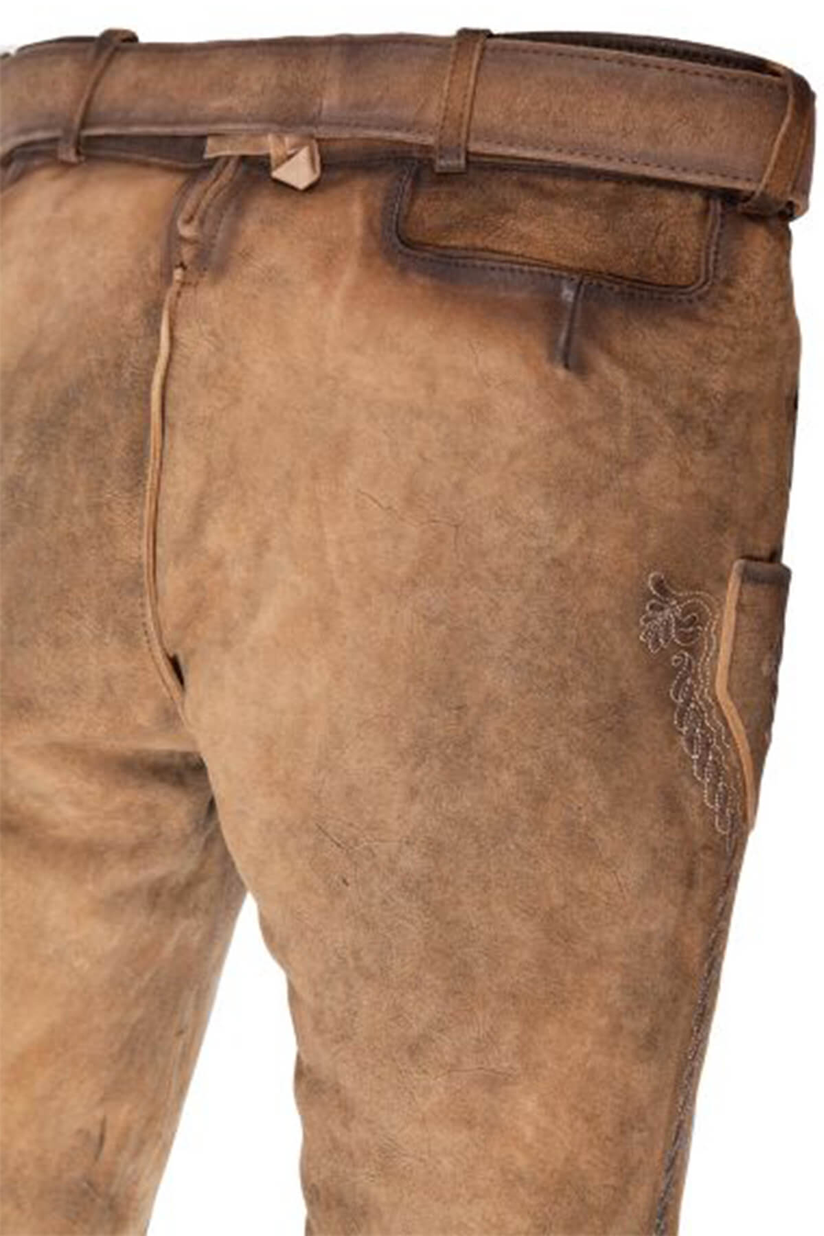 - Detail: Traditional Bavarian embroidery on flaps and legs.