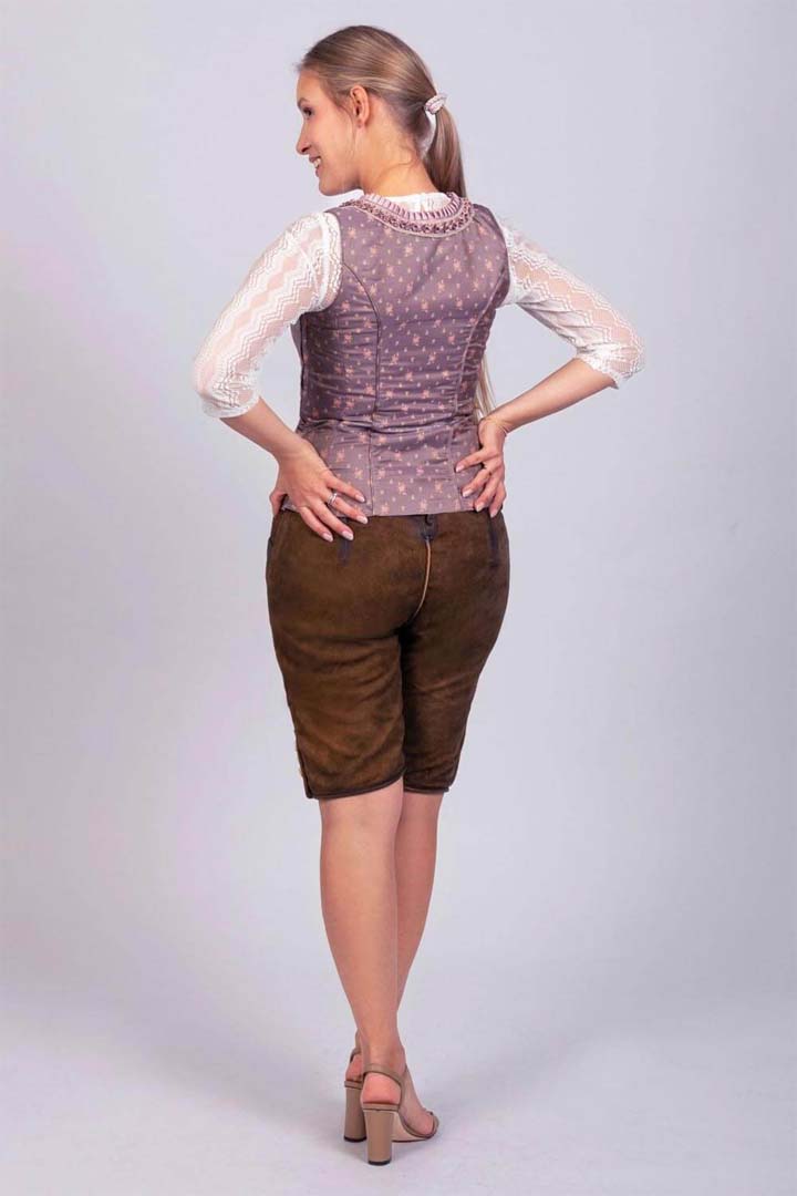 Additionally, expert embroiderers add delicate designs to these Ladies Bavarian Lederhosen, softening the tough suede. A patterned mauve bodice adds visual depth to the rich chocolate tint. As a result, the design skillfully and tastefully combines traditional robustness with contemporary, fashion-forward elegance.