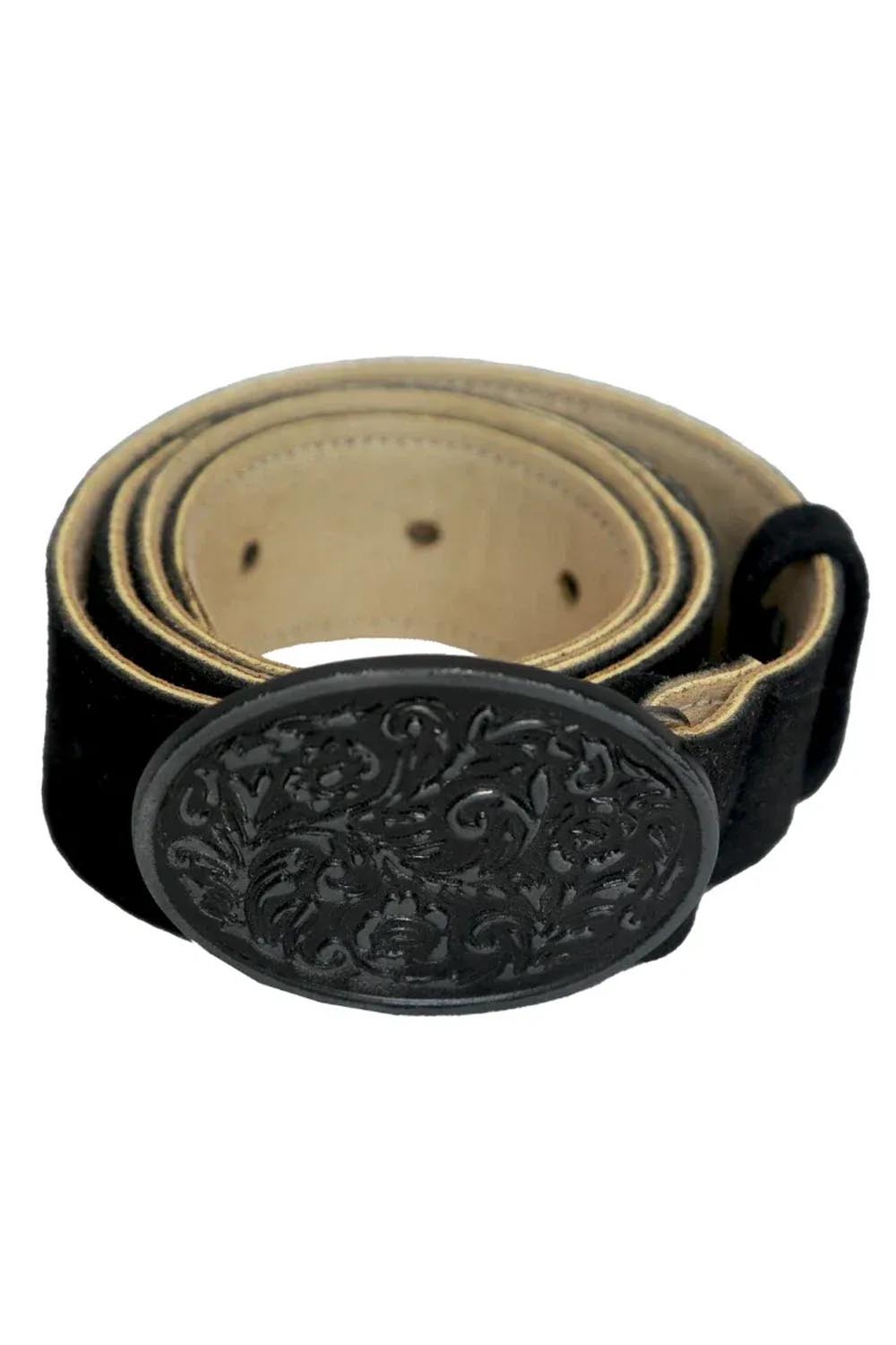 At the center, an oval buckle displays embossed floral designs inspired by alpine art. Additionally, hand-finished edges and black hardware complement each other, which keeps this Traditional German Belt versatile and timeless.