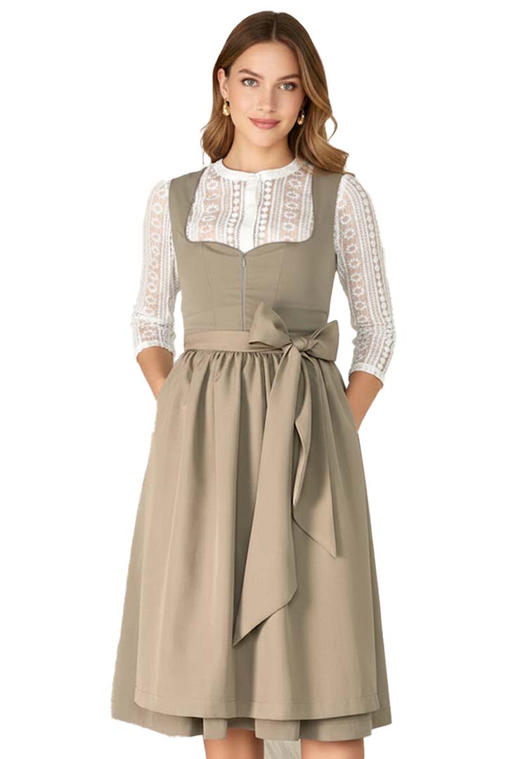 Furthermore, the neutral tone blends effortlessly with classic jewelry and modern accents. The defined waist enhances structure, while the fabric keeps its refined finish over time. Inspired by traditional fashion, it pairs well with Bavarian Lederhosen For Women aesthetics and complements Trachten Skirts for versatile styling.