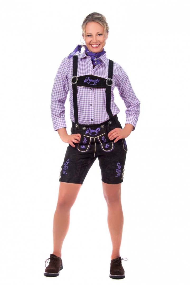 Beautiful black goat suede shorts with real horn buttons and vivid purple flower embroidery. These long-lasting, soft clothes have a high-end quality, combining traditional Bavarian craftsmanship with a chic, contemporary festival-appropriate feminine fit.